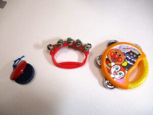 タンバリンや鈴、カスタネットに触れて遊びました。タンバリンを手でたたいたり、鈴を振ったりして音を鳴らしていました。楽器によって音が違うためそれぞれの楽器を鳴らし、興味津々でした。「しあわせならてをたたこう」や「おもちゃのチャチャチャ」等の曲に合わせて楽器遊びを楽しみました。
