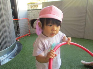 靴下や靴を履き、ボールやフラフープなどの玩具を使って好きな遊びをする子どもたち。お話も上手になってきて、外の景色を見ながら車を見つけると「ぶーぶー」と言ったり、「ばいばーい」と手を振りお見送りもしたりしてします。たくさん動いてのびのびと外遊びを楽しむこりすさんでした。