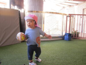 靴下や靴を履き、ボールやフラフープなどの玩具を使って好きな遊びをする子どもたち。お話も上手になってきて、外の景色を見ながら車を見つけると「ぶーぶー」と言ったり、「ばいばーい」と手を振りお見送りもしたりしてします。たくさん動いてのびのびと外遊びを楽しむこりすさんでした。