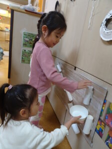 秋の自然に触れて遊ぶことを楽しんでいます。ペーパーの芯やスライダーなど様々な方法を使ってどんぐりを転がすと「すごい!はやいよ」と大興奮です。何度も遊ぶうちに「ここにいれてみて!」とお皿に目掛けてどんぐりを転がすなど遊びがどんどん発展しています。