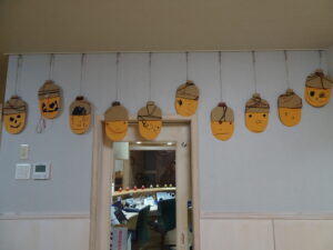 どんぐりの製作では、顔を描いたり帽子の部分に紐を巻き付けたりしました。「めはふたつあるよね」「おはなはひとつ」と顔のパーツを言いながら一つ一つ丁寧に描いていました。素敵などんぐりが完成しましたよ。