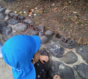 園外散歩に行きました。「お散歩行くよー!」と伝えると、「やった~!」と嬉しそうなりすのお友達です。公園内には、松ぼっくりや紅葉した葉がたくさん落ちていて「まつぼっくり!」と言いながら、手からこぼれ落ちるほど松ぼっくりを拾い集めてお友達のところまで運んで見せ合ったり、保育者やお友達と一緒に段の上に集めて並べたりしていました。紅葉した葉も集めては上から散らしたりブルドーザーのようにして運んだり、それを見たお友達も一緒に真似して遊びを楽しんでいましたよ。