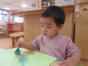 クリスマスの歌や飾りに 興味津々の子どもたちは、タンポや風船スタンプを 使ってクリスマスツリーを作りました。 色が混ざり合ったり、模様ができると 嬉しそうな表情を浮かべたり作ったツリーを指差し 「みて」と保育者に伝えたり…