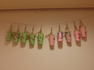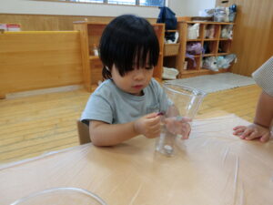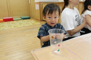 初めにコップにシールを貼りました。