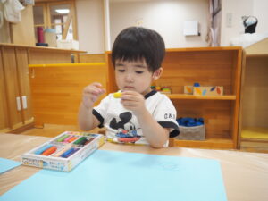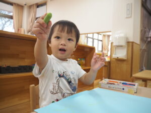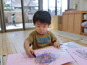お絵描きでは、クレヨンで線や丸を描くと、ぐるぐると力いっぱい描いたり、