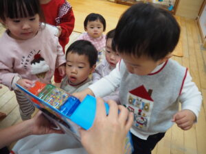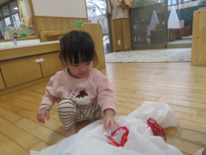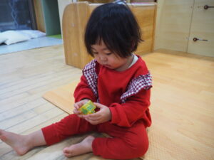 「おっ」と保育者と顔を見合わせ嬉しそうに