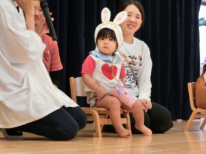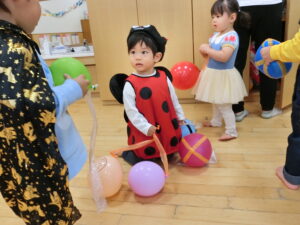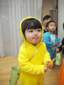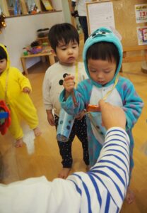【1歳児】ハロウィンパーティー【11月の様子】 2025/11/28 10月31日(金)に ハロウィンパーティーを 行いました。 朝から「みてみて!」と かわいい衣装や服を 保育者に見せに来てくれたり、 友だちの衣装に 興味津々で見に行ったり、 衣装を着て雰囲気を 楽しみました。 自分たちで作った ハロウィンバックを 手に持ち園内を歩いて 回る姿がとても可愛らしく、 バックにたくさんの お菓子を受け取り 喜ぶ姿も見られました。 今後もみんなで 季節ならではの イベントを楽しめるよう、 思いを受け止めながら 関わっていきたいと 思います。
