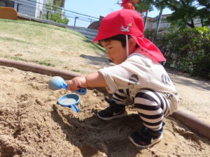 園庭遊びでは、様々な遊びを通して保育士や友だちとやりとりを楽しんでいます。砂場では、アイスクリームやカレーライス等料理を作り「どうぞ。」と運ぶ姿や「おいしいね。」と食べる真似をしたり、砂場の玩具を使い型抜き以外にもクッキーやお皿に見立てたりして友だちとイメージを共有しながらやりとりを楽しむ姿が多く見られるようになってきました。