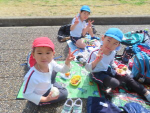お昼は、らいおんぐみの友だちとお弁当を食べ、