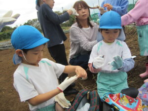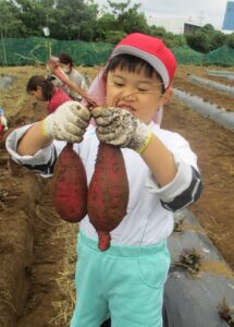 全体が見えるまで掘るのが大変で、「誰か手伝って~」と助けを呼ぶ姿もありましたが、無事に芋を収穫することが出来てとても嬉しそうにしていました。