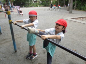 友だちと一緒に鉄棒に挑戦したよ 2025/10/15 かりん公園や川和富士公園の遊具広場などに散歩に行くと必ず鉄棒がないかを探している子どもたち。保育士の傍に来て「先生、鉄棒上手く出来るようになりたいからやって良い?」と聞き、「やって良いよ」と言うと「やったー」と言って鉄棒に行き、やる前に手を置く位置など友だちや保育士に聞きながら鉄棒に挑戦しています。 保育園で行う体操教室でも更に上達出来るように頑張っています。