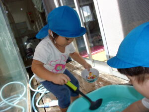 指人形すくい(1歳児) 2022/09/17 水遊びで、指人形すくいをしました。おたまやスプーンなど、水遊び用の玩具を片手に、プカプカと浮いている指人形を何度もすくって遊びました。 すくうたびに「取れた!」「見て!」と、教えてくれ嬉しそうにする子どもたちでした。