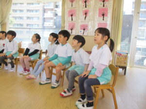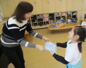 英語教室 2026/03/31 みんなが大好きな英語教室最終日。講師が「おはよう」と挨拶をすると大きな声で挨拶をしていた子どもたち。今日は何をするの?と講師に話掛けていて、まず始めに自分の誕生月の絵カードが出てきたらすぐに立つように話しがあるとすぐに立っていました。その後みんなが大好きな大きな絵本を使ったストリータイムが始まると、最後まで静かに話を聞いていました。最終日だったので、一年間頑張って英語教室に参加したので、一人ずつ講師から証書を渡してもらい喜んでいました。
