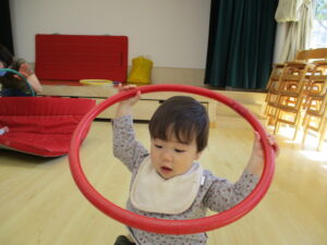 運動遊びたのしい!0歳児) 2023/05/01 この4月に入園した子ども達。いつもの保育室から出て、ホールで過ごすことにしました。マットの坂をハイハイしたり、フラフープをくぐったり、身体を動かして遊びました。 マットのお舟では、ゆらゆらと揺れてご機嫌でした!