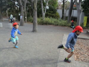 公園に着いた際に風があり少し寒かったので、身体を温めるために皆で公園内をマラソンをしました。始めは皆で10周を目標に走っていましたが、走るうちに「もっと走りたい!」となり、30周を目指して走りました。 走った後は、身体も…