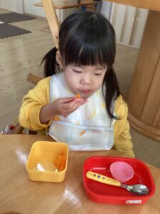 朝から自分のお弁当の入っている袋を見つけると嬉しそうに指をさし楽しみにしています。いざ蓋を開ける時には覗き込むようにしてわくわくする姿もあります。 好きな食べ物が入っていると「あった!」と嬉しそうに指差しをしたり、友だち…