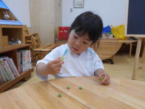 初めての綿遊びを楽しみました。ふわふわな感触に大興奮な子どもたち。 「雪みたい!」とふわっと舞うように楽しむ子や、「かき氷でーす」とお皿に乗せて食べる真似をする子の姿がありました。 感触遊びや見立て遊びが大好きな子ども…