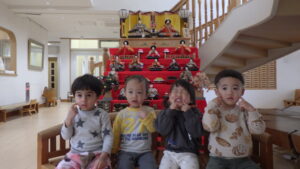 本園にある大きなひな人形を見て、「大きいね」「すごーい!」などと興味津々の子どもたちです。