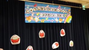 初めての生活発表会~本園~ 2025/12/25 絵本や手あそびが大好きな子どもたちは、日常の生活の中で保育者と一緒に表現あそびを楽しむ姿が増えてきました。 保育者の動きや絵本の簡単な言葉を真似っこすることがとても上手な子どもたちです。 初めての発表会で緊張した様子でしたが、可愛らしい姿を見せてくれました♪