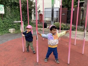 1歳『園外散歩』 2025/12/04 誘導ロープを使い、ホールや乳児園庭等様々な場所でお散歩ごっこをしてきた子どもたち。今月はついに園外に出掛けました。 道中では歌をうたったり保育士とやりとりしたりしながら公園に向かいます。 公園ではアスレチックの上から顔を出したり自然物を見つけ触れてみたりと楽しんでいました。帰園後は「楽しかったね」「また行きたいね」と話す姿がありました!