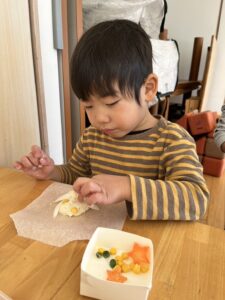 12月 2歳児 「雪だるまパン作り」 2022/12/24 クリスマスをより楽しめるよう、食育の一環として雪だるまパン作りをしました。まずは、パン生地を使って雪だるまの形作りからスタート。生地を2つにちぎり、丸める子もいれば、ちぎらずに伸ばす子など生地の感触を楽しみながら思い思いに雪だるまを作っていました。形ができたら次は野菜で飾りつけ。用意しておいた‟星形のにんじん”や‟グリンピース”などを目や口、鼻などに見立てたり、好きな野菜を自由に乗せたり…。個性豊かでかわいい雪だるまが完成しました。季節の行事を様々な活動を通して楽しめるようにしていきます。