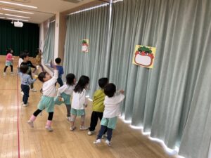 2月 行事 「節分」 2023/02/28 2月3日(金)、節分の日。保育園では、各年齢に合わせた豆まきを行い、行事に触れました。 乳児クラスの子どもたちは、鬼の絵が描いてある的に向かってボールで的当てをしました。ボールが当たると「やった~」と嬉しそうな子どもたち。幼児クラスの子どもたちは、節分に関するクイズを行い、由来を知ることができました。本物の豆を使って豆まきも行いましたよ。「鬼は外ー!福は内ー!」と元気いっぱいの子どもたちでした。 季節ごとの行事を楽しむ中で、文化や伝統を伝えていきます。