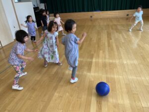 雨が多い季節ですが、身体を動かす遊びや様々なルールのある遊びをホールで行っています。今月は“中当て”をしました。