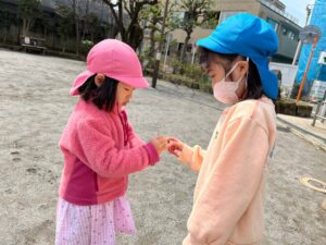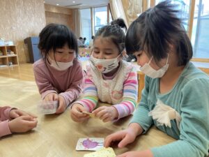 今月は寒天遊びをしました。赤、青、黄色の大きな寒天を見せると「ゼリーだ」「気持ちいい!」と言葉で伝え合う子どもたち。両手を使ってぎゅっと握ってみたり、指でツンツンとつついてみたり、感触に夢中になって楽しむ姿がありまし…