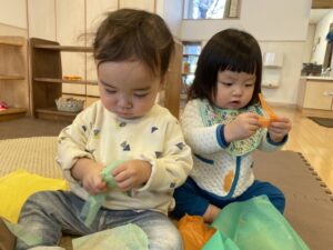 様々なものに興味を持ち、自ら手にすることが増えた子どもたち。そこで、いろいろな感触が楽しめるように、袋の中にフェルト素材のカラフルな玉やビーズを入れてセンサリ―バックを作りました。 子どもたちの前に出すと「なんだろう…