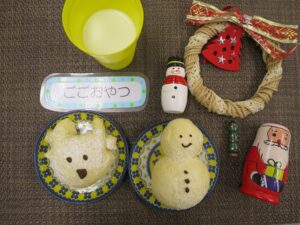 おやつの手作りパンの中には生クリームを入れ、トナカイや雪だるまの形にしました。おやつを見た子どもたちからは「かわいいー!」「わたしは雪だるま~!」とたくさんの笑顔が溢れていました。