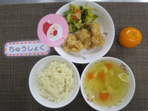 今年の給食は『コンソメライス、鶏のから揚げ、ブロッコリーのサラダ、マカロニスープ、みかん』で、おやつは手作りの『おたのしみパン』を用意し、クリスマス限定の特別メニューでした。