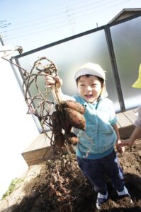 天候の影響もあり、ようやくできたさつまいもほり。前日に、さつまいもの紙芝居を見ていたこともあり、土の中に育っていくことや、掘り方をよく覚えていました。「さつまいもの近くは優しく掘るんだよ」と友だちと教え合いながら掘って…