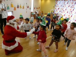 今年も保育園にサンタさんが来てくれました! 乳児クラスの子は絵本で見ていたサンタさんが登場してびっくりした様子。泣いてしまう姿もありましたが、サンタさんがプレゼントを袋から出すと…興味津々。沢山のプレゼントに嬉しそうな…
