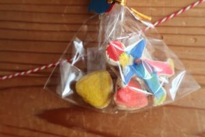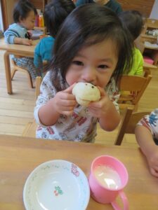 12月24日にクリスマス会が行われ、給食とおやつもクリスマスメニューを提供しました。 今年の給食は『コンソメライス、鶏のから揚げ、ブロッコリーのサラダ、マカロニスープ、みかん』で、おやつは手作りの『おたのしみパン』を用…