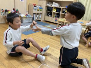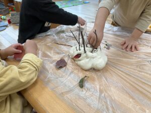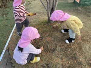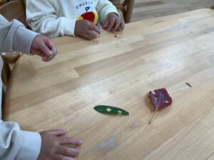 11月は自然物に興味を持ち、園庭のキンモクセイや落ち葉、木の枝等を集めたり並べたりして楽しみました。給食に見立ててカップに入れ、ままごと遊びをしたり、「たんたんたんじょうび」の歌を歌いながら粘土に自然物を付けてケーキを 作ったりと、秋ならではの遊びを楽しみました。