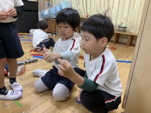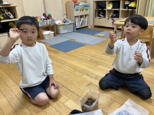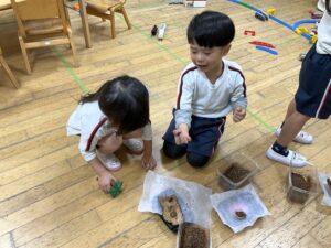 クワガタを10月から飼い始めました。4匹それぞれに子どもたちが考えた名前をつけ、毎日「動いてるよ!」「土の中で眠っているのかな?」と観察しています。最初は怖がっていた子どもも、クワガタを触れるようになっていました。