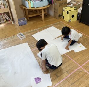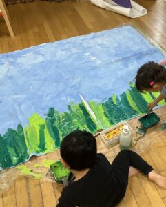 12月の発表会では、”白雪姫”の劇を行うらいおん組の子どもたち。クラスのみんなで話し合いをして題材が決まると、イメージを共有しながらセリフを考えたり、身振りを付けて表現を楽しんでいます。又、大道具は何が必要か、何を作りたいかも考えながら進めていき、発表会を心待ちにしています。