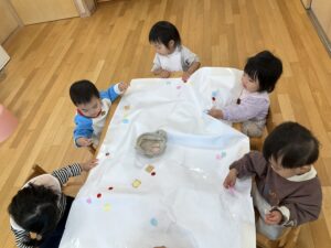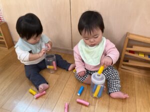 指先を使う遊びをしました。月齢に合わせてポットン落としやテープ剥がし、シール貼りをしました。物をつまむ事が上手になってきて、出来ると“見て見て”と保育者に見せてくれます。