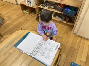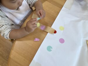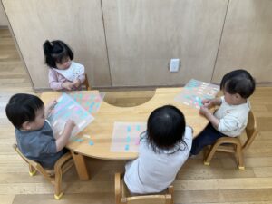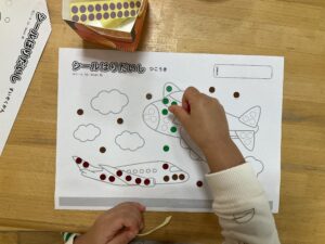 8mmのシール貼りをしている様子です。どんどん指先の動きが器用になり、丸の枠に収まるように貼ろうとしています。また、気の合う友だちと「飛行機に乗った事あるよ」とお話をしながら楽しい雰囲気の中で遊んでいます。