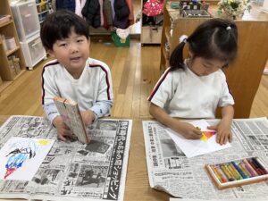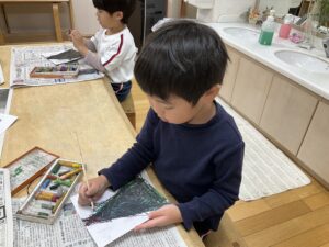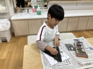 クリスマスツリーを製作しました。まず、保育者がお手本を見せると、「真っ黒にするの!?」と驚く子ども達です。その後、割り箸で削ると模様が浮かび上がるのを見て、「魔法みたい!」「やってみたい!」と早速チャレンジしました。「どんな色にしようかな」「どんな風に削ろうかな」と一人ひとりイメージを膨らませながら楽しむ姿が見られました。今後も様々な技法を使って製作遊びを楽しんでいきたいです。
