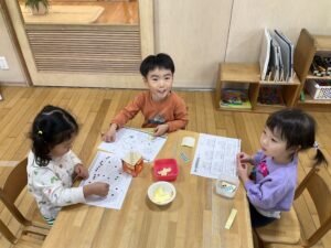 8mmのシール貼りをしている様子です。どんどん指先の動きが器用になり、丸の枠に収まるように貼ろうとしています。また、気の合う友だちと「飛行機に乗った事あるよ」とお話をしながら楽しい雰囲気の中で遊んでいます。