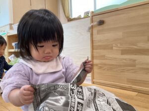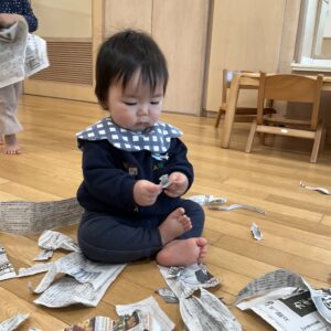 お部屋で新聞紙遊びをしました。初めて新聞紙で遊んだ時には、保育者がやぶった新聞紙を渡しくしゃくしゃにして遊ぶだけでしたが、この日は新聞紙を手に取って細かくちぎったり、ビリビリに破って楽しんでいました。見ていることの多かった低月齢の子どももちぎって遊べるようになりました。指先を使った遊びも上手になり、一年間の成長を遊びの中で感じる事が出来てとても嬉しく思っています。