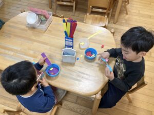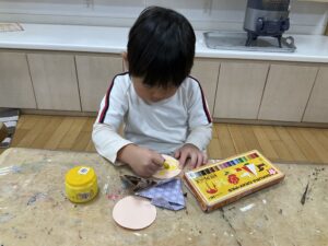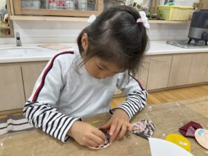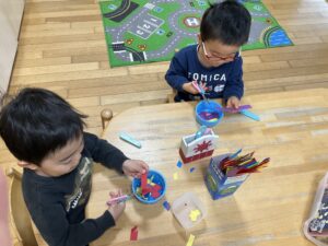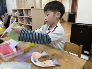 ひなまつりの絵本を読んだり、歌を歌ったりする事を通してひなまつりに興味を持ち、「お人形を作りたい!」と子ども達から声が上がりました。折り紙や花紙など様々な素材を使い、“優しいおひな様がいいな”“かっこいい顔にしよう”とイメージを膨らませながら楽しみました。覚えた歌を口ずさみながら製作をする姿が可愛らしい子ども達でした。