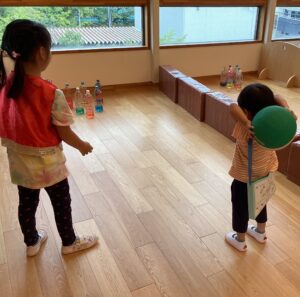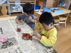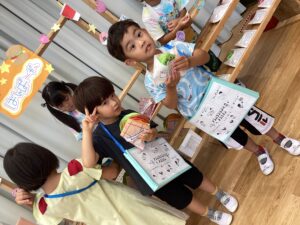 食べる真似をしながら、友だちと一緒に楽しむ子どもたちでした。