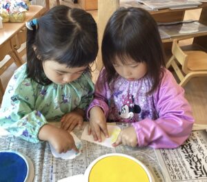 かき氷の飾りでは、色鉛筆や指絵の具で
