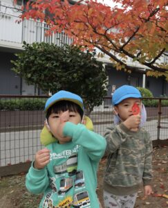 「赤い葉っぱあったよ!」「どんぐりもあるよ!」と