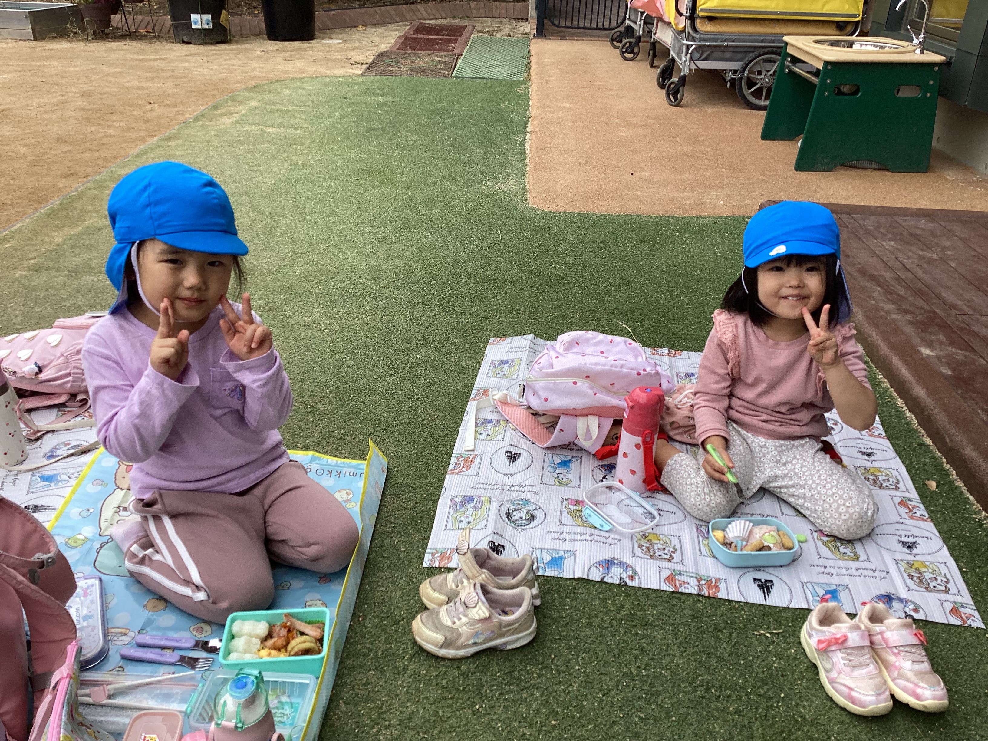 友だちと一緒に戸外でお弁当を食べて、にこにこ笑顔♪