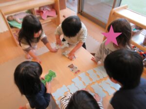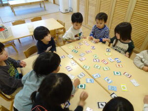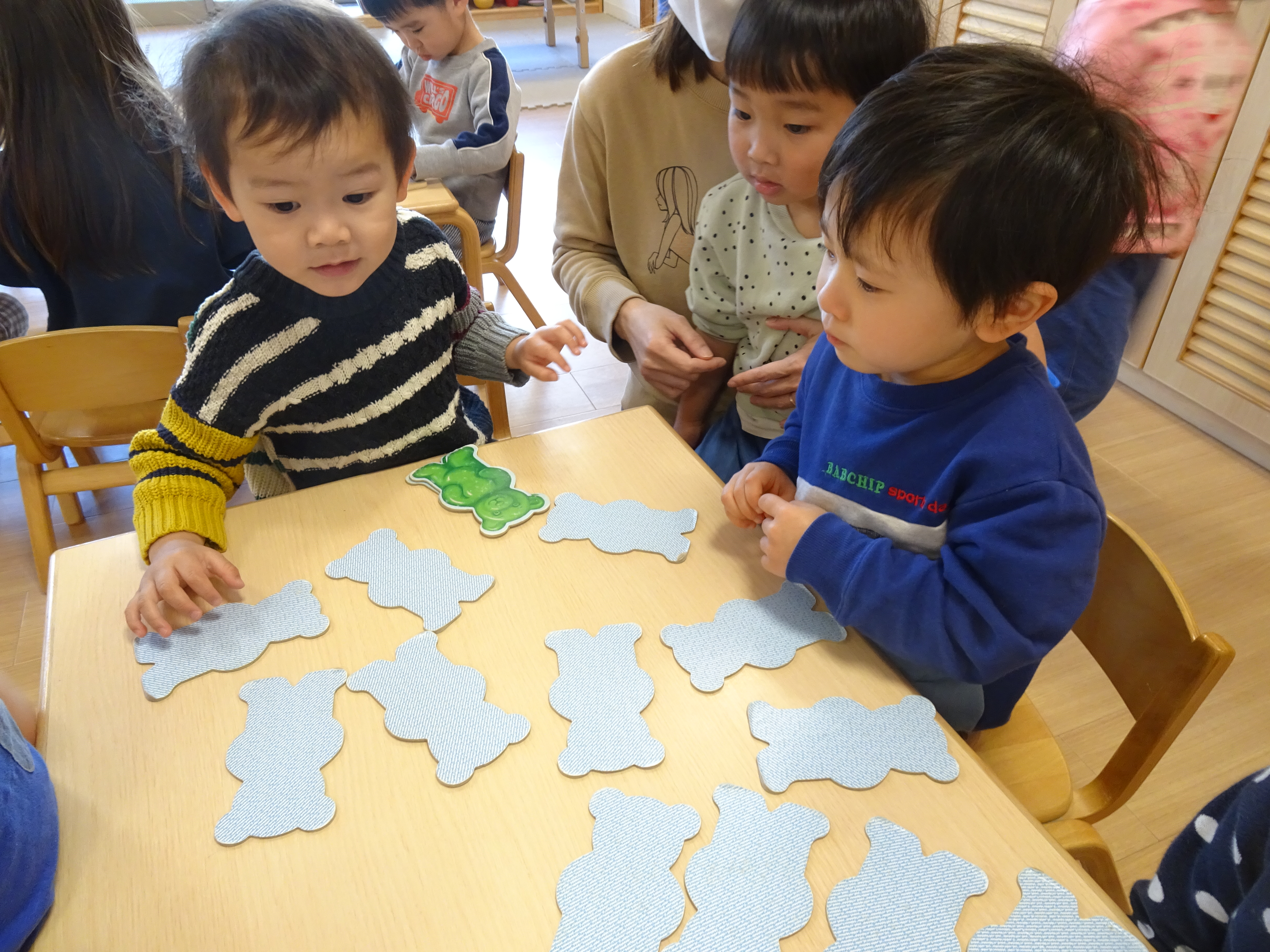 先生が持っているカードと同じ洋服を着たクマのカードを