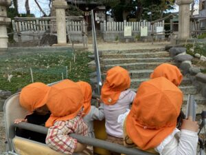 避難車に乗ると、「でんしゃ!」「じんじゃ!」と出発を楽しみにする子どもたち。