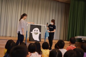 8月のお楽しみ会では「おばけのばけたくん」シアターをしました。